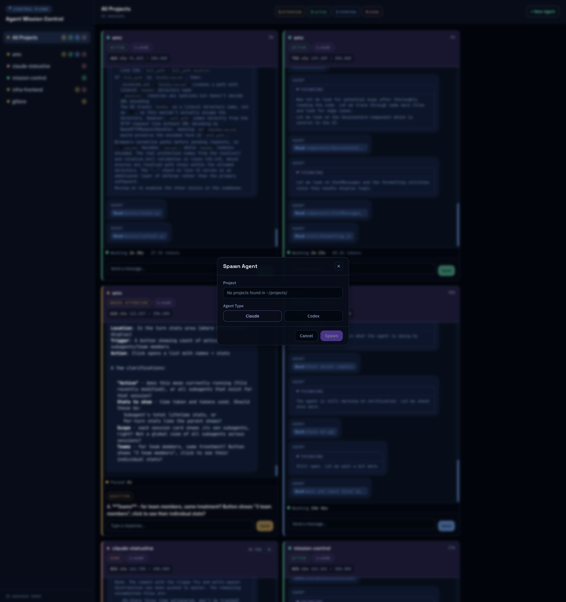 Position the spawn modal directly under the 'New Agent' button without a blur overlay. Uses click-outside dismissal and absolute positioning. Reduces visual disruption for quick agent spawning.