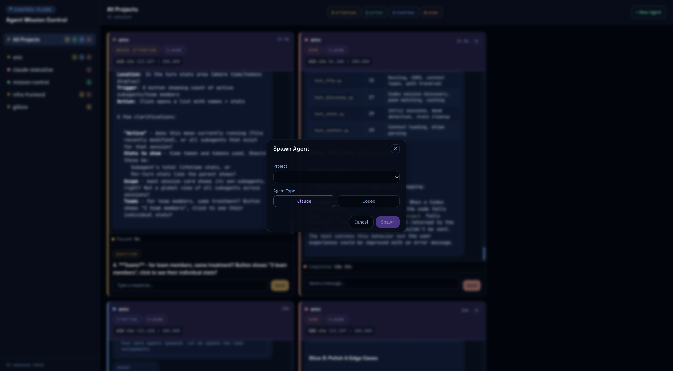 Position the spawn modal directly under the 'New Agent' button without a blur overlay. Uses click-outside dismissal and absolute positioning. Reduces visual disruption for quick agent spawning.